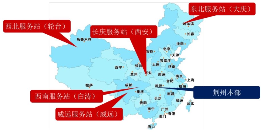 世纪派创在全国各油田设有六个技术服务站,分别包括:荆州本部、西北、东北、长庆、西南白涛、威远,常驻服务人员近百人。